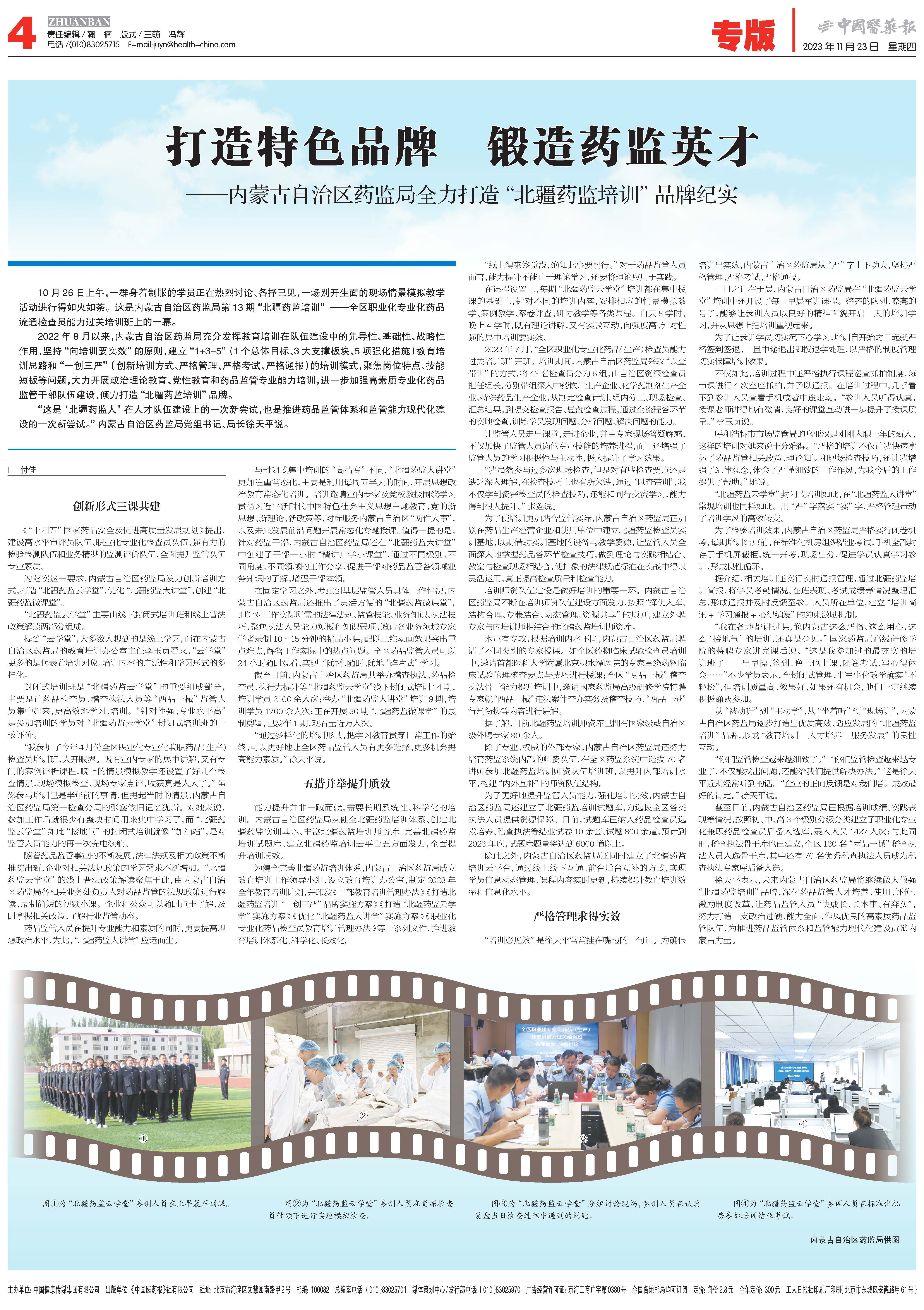 2022年8月以来,内蒙古自治区药监局充分发挥教育培训在队伍建设中的先导性、基础性、战略性作用,坚持“向培训要实效”的原则,建立“1+3+5”(1个总体目标、3大支撑板块、5项强化措施)教育培训思路和“一创三严”(创新培训方式、严格管理、严格考试、严格通报)的培训模式,聚焦岗位特点、技能短板等问题,大力开展政治理论教育、党性教育和药品监管专业能力培训,进一步加强高素质专业化药品监管干部队伍建设,倾力打造“北疆药监培训”品牌。