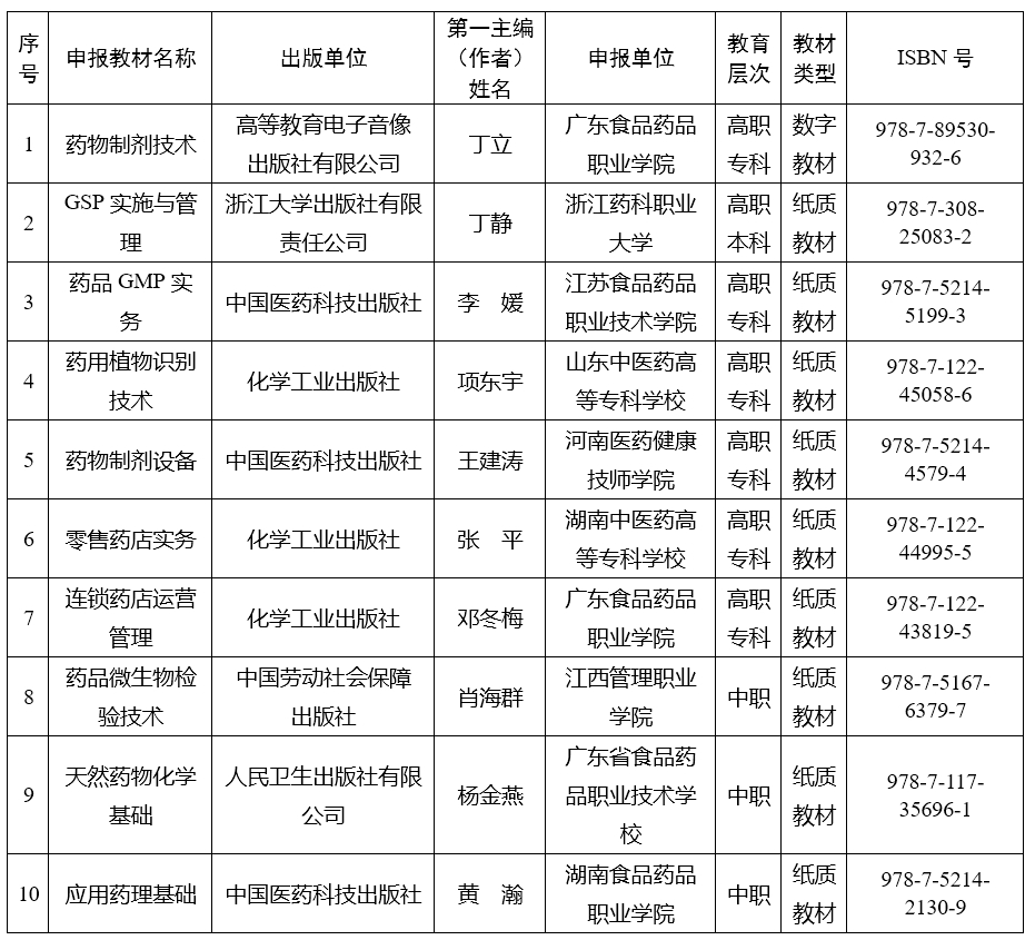 根据《教育部办公厅关于组织开展第二批“十四五”职业教育国家规划教材遴选工作的通知》(教职成厅函〔2025〕1号)要求,全国药品职业教育教学指导委员会(以下简称药品行指委)组织开展了药品与医疗器械类相关专业教材申报与推荐工作。经专家评审,拟推荐第二批“十四五”职业教育国家规划教材10本(包括3本中职教材和7本高职教材),现将拟推荐名单予以公示。